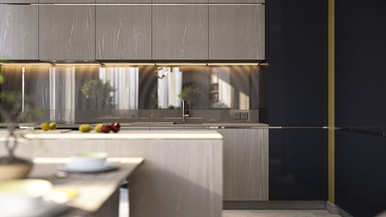 To fit harmoniously the joint space, the kitchen has been designed in a minimalist style, using straight lines and clean shapes. We have used built-in handles to keep this laconic appearance. The vertical graphite cabinetry conceals a built-in fridge and some storage space. The kitchen island provides additional storage, work space, and the ability to socialize while cooking.