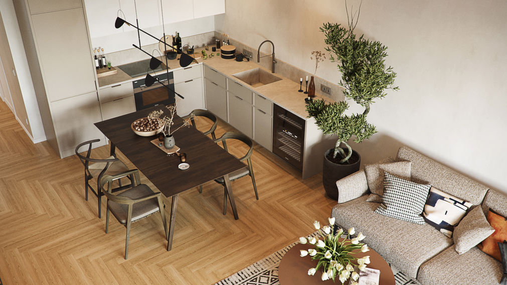 The apartment’s plan is compact yet fluid, shaped for both comfort and social life. The open-space area connects kitchen, dining, and living into a single cohesive flow. At the window, a desk integrates seamlessly into the layout, offering a quiet corner for work, while the generous soft seating zone accommodates gatherings of friends — complemented, naturally, by a dedicated wine fridge.